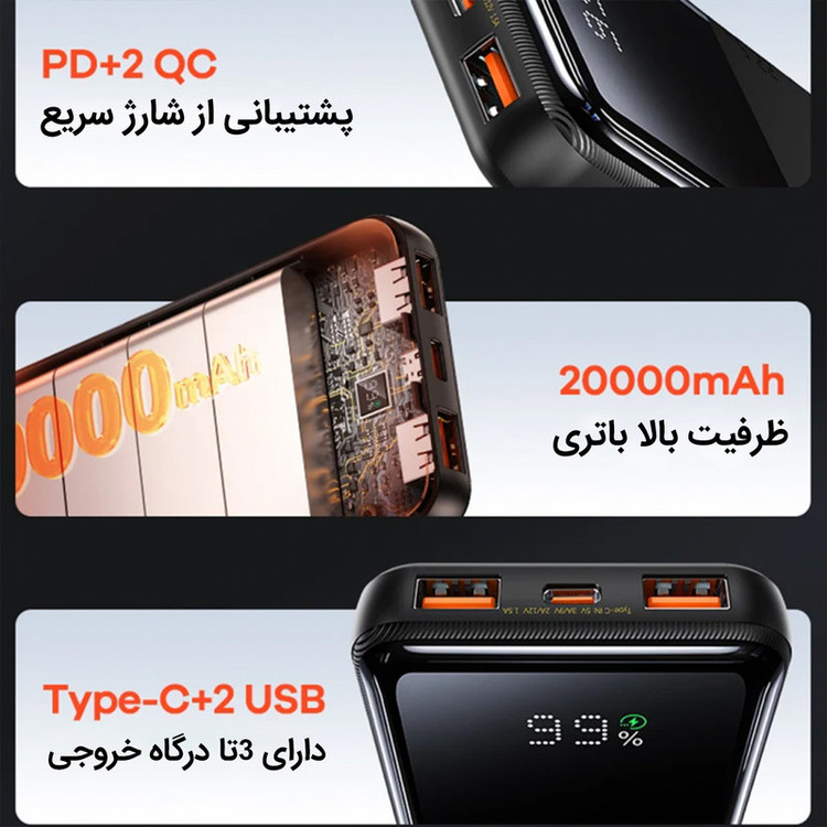 خروجی تایپ سی ــــــــــــ> ۵ولت = ۳ آمپر , ۹ ولت = ۲.۲۲ آمپر , ۱۲ ولت = ۱.۶۷ امپر. ( ۲۰ وات توان خروجی ) خروجی USB 1 ,2 ــــــــــــ>. ۱۰ ولت = ۲.۲۵ آمپر , ۵ ولت = ۳ آمپر , ۹ ولت = ۲ امپر. ( ۲۲.۵ وات توان خروجی )